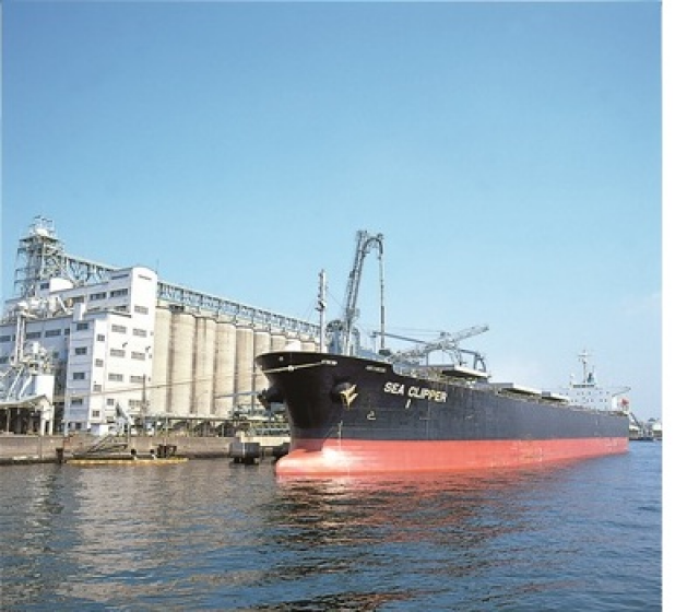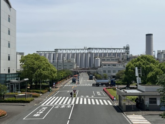 見学当日は、オーストラリアから原料の菜種を積んだ大型船が埠頭に接岸していました。原料は、荷揚げ機を使って吸い上げ、全ての荷揚げ作業が完了するまでには、通常3日から1週間ほどかかるそうです。荷揚げされた原料は、敷地内にある191本の原料サイロに保管されます。また、国内航路向けの埠頭は敷地内に2カ所有し、油やミールを出荷する際に使用されています。